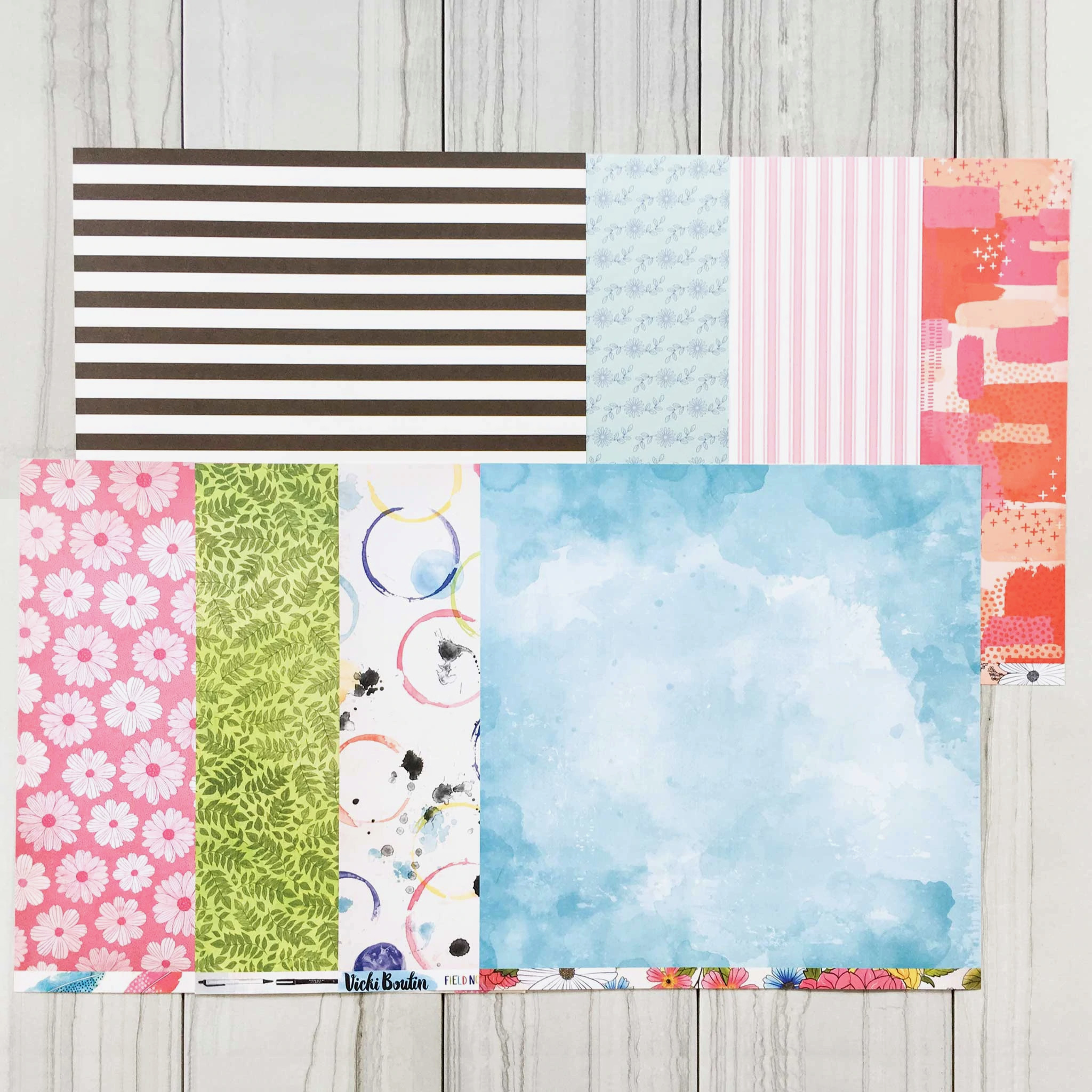 Getting my SCT Sampler kit in the mail each month is a bright spot. This small affordable package is just enough newness + surprise to keep me satisfied. This month the package contained products from Vicki Boutin and Pinkfresh Studio. Take a look…