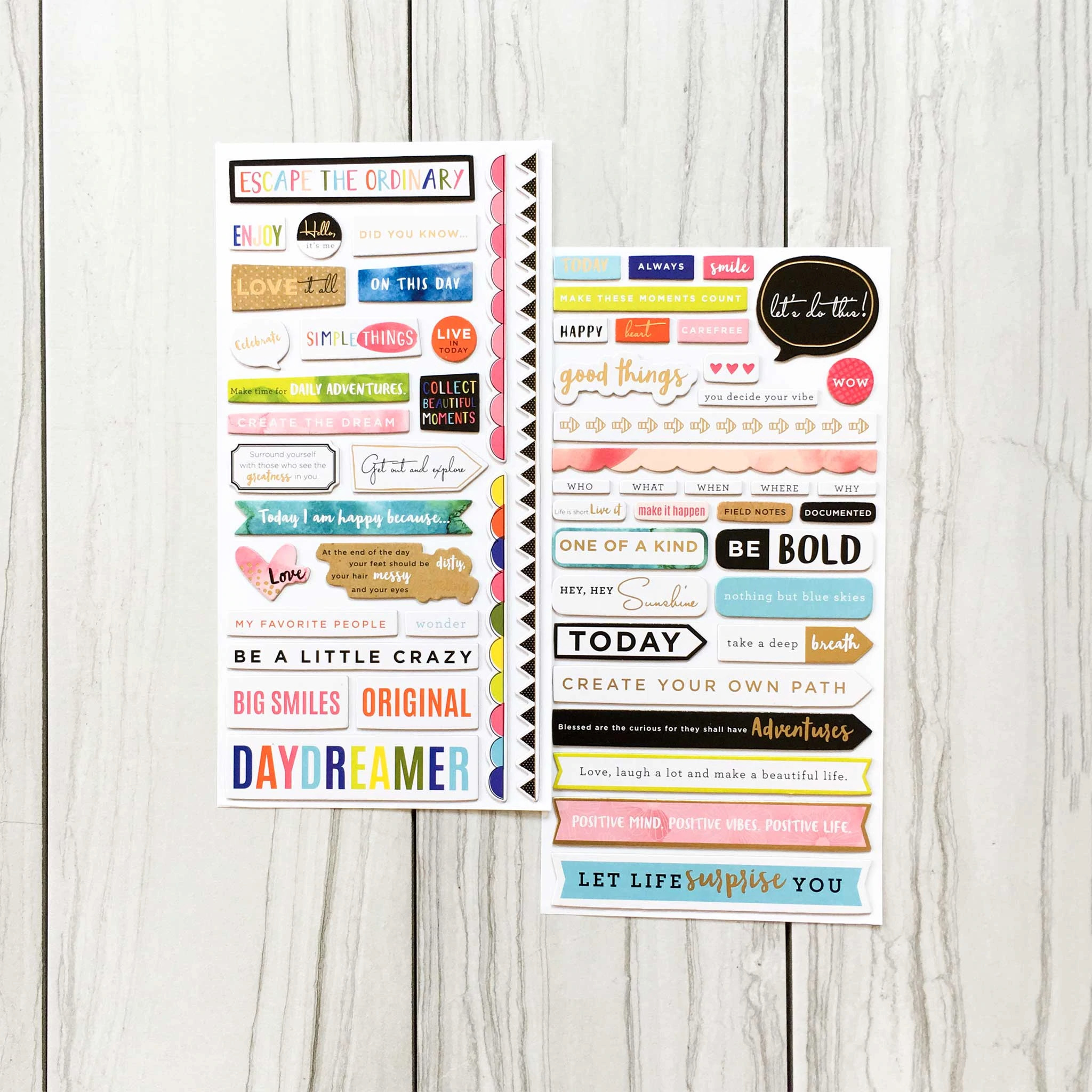 The embellishments started with a Jen Hadfield cut-apart sheet, much like the one in the inspiration papers. And I added in gold phrases, and Vicki Boutin die cuts. Plus birds, butterflies and feathers from many of the icons made for great embellies. I chose those in wood veneer inspired by the wood buttons. I also added corrugated cardstock for more wood vibe. I needed more texture so in with the twines. As I bonus I had that washi tape sitting on my desk from my recent washi review so I tucked that in as well. Add some alphas and the kit is complete.