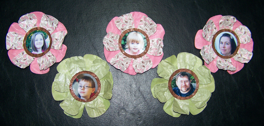 2. Choose papers for your flowers. I decided to make the flowers have two layers with a center circle to hold the photo. I chose pink papers for the girls in the family and green papers for the boys with brown paper for the center. Each flower has a solid cardstock as the bottom layer and a pattern paper as the top layer. I cut the flowers at 5.25″ and the center brown circles at 2.5″ again using real dial to be sure they come out the size I expectt. Everything then got a good spray of shimmery inks. While the pieces were still wet I crumpled them up and then smoothed them back out to give them more texture. After they dried I assembled everything, using pop dots to lift up the center of the flower just a bit.