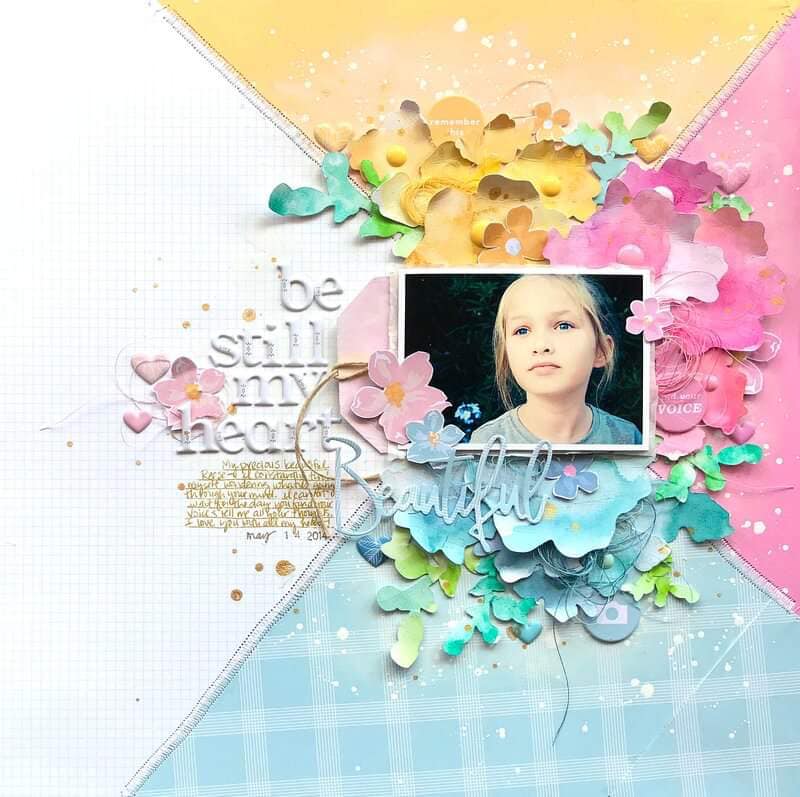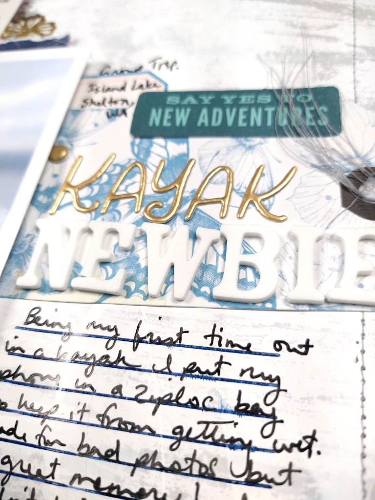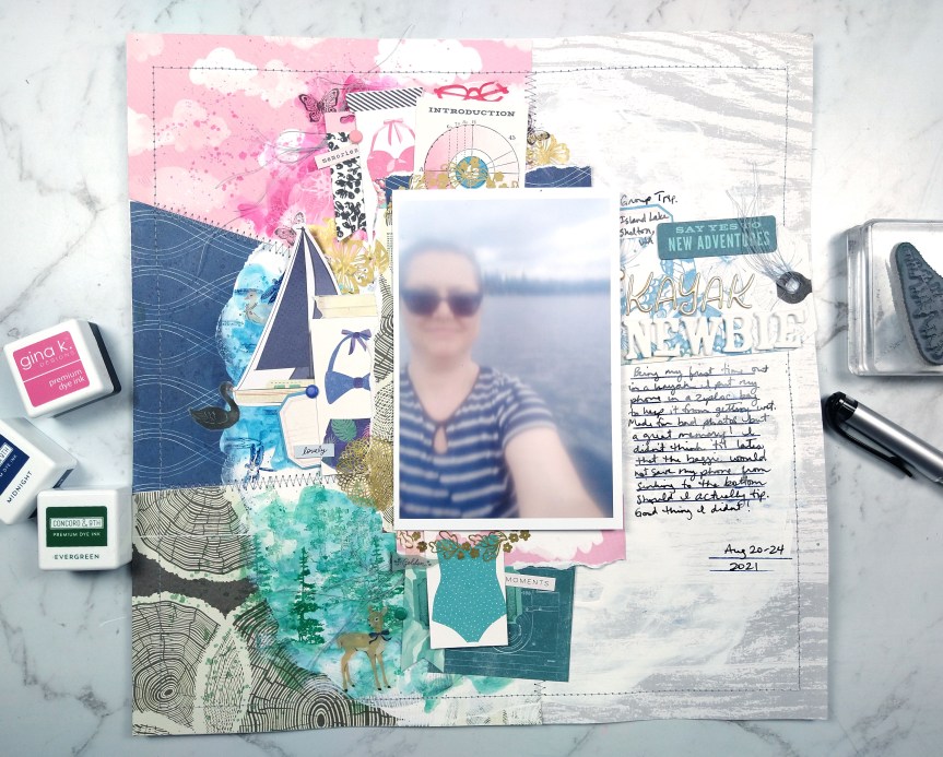 I had fun playing with plenty of ink (as paint!), stamps, and die cuts for my own interpretation. You’ll notice the photo is very fuzzy. That isn’t you, or my graphic, it is actually how the picture was taken! I was on my first kayak trip and my phone/camera was in a ziplock to keep it dry. I was too nervous about dropping it in the water to take it out of the ziplock. But do I let a bad photo stop me from scrapbooking? Never!