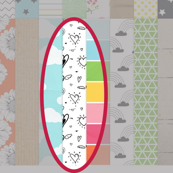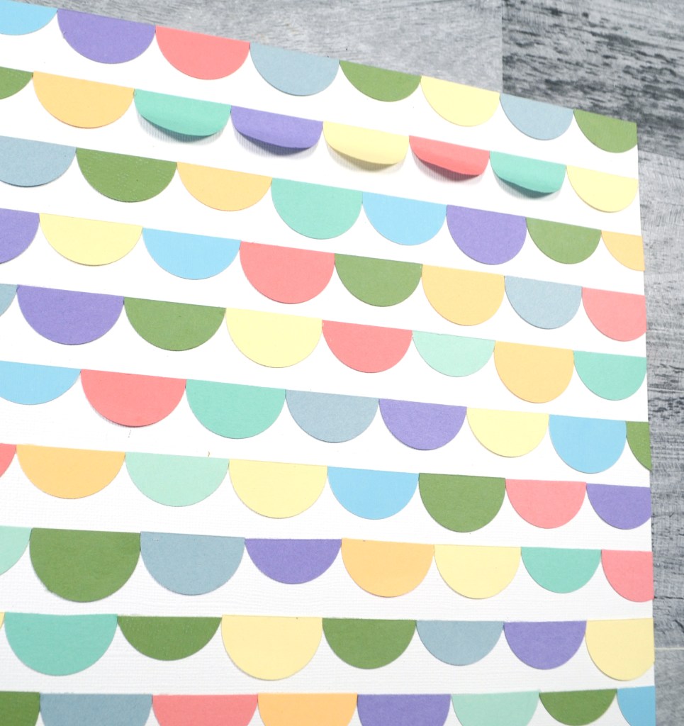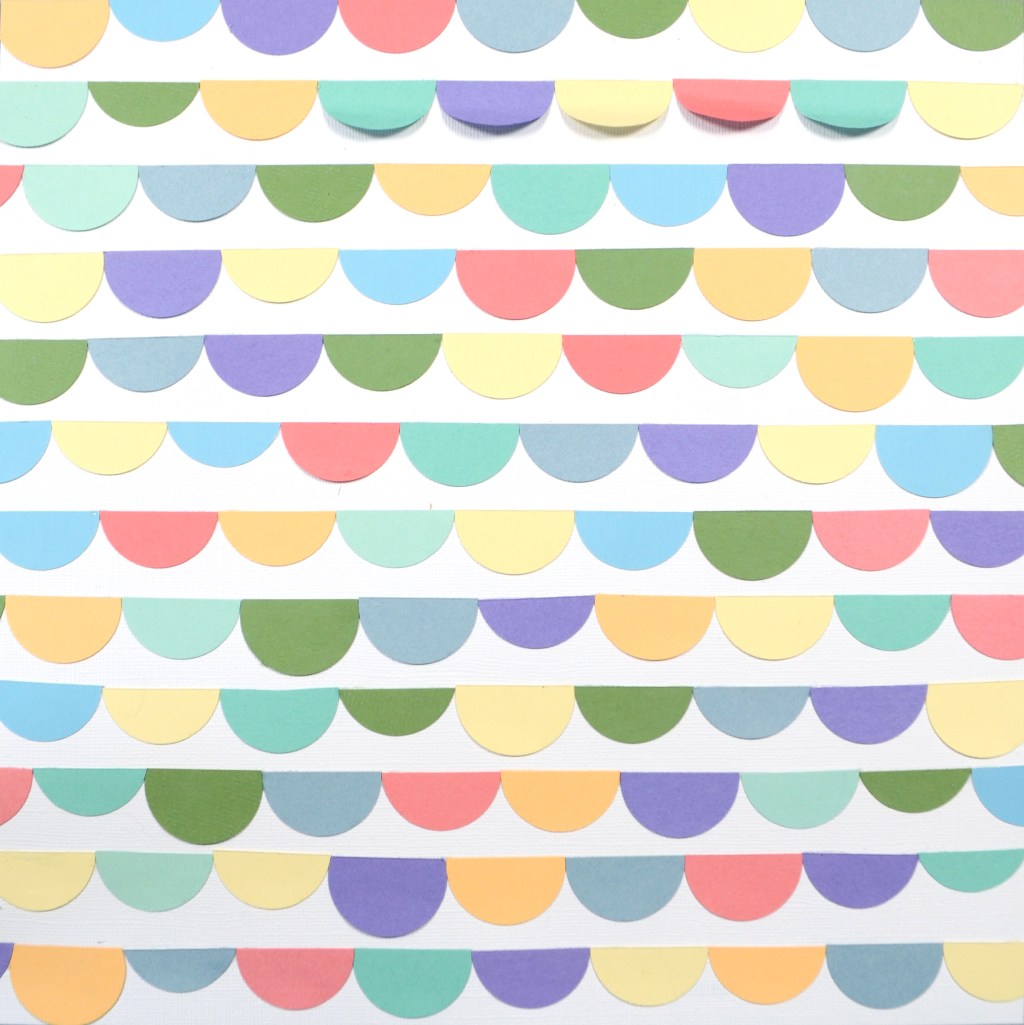 Here is how that stripe paper turned out. I am rather pleased with it. The trick with a diagonal stripe has to do with math. The diagonal of a square is always longer than the sides. In the case of 12×12 pattern paper, that diagonal is almost 17 inches (if I did my math right ๐). That means you either have to cut a whole new paper right on that diagonal or piece together shorter pieces to reach across the span. In my case I used both.