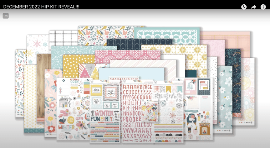 Alright, now we can take a look at the inspiration piece. I grabbed this screenshot from the Hip Kit Club YouTube video kit reveal. The graphic was just much clearer that the website photos. Odd. Anyway, I took inspiration from the kit for these elements: yellow, aqua, pink, navy, grids, stripes, woodgrain, birds and foliage, chipboard, die cuts, homey icons, and snowflakes.