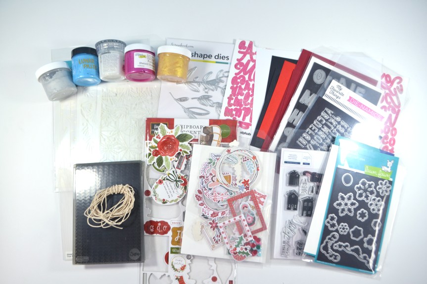 Hip Kit Club offers a wide range of add-ons for their kits, so I did take a look at those as well. A few things caught my eye. I liked the wood grain foliage pieces in the embellishment set, the idea of mixed media and the sweater texture of the metal die. So all these ideas got incorporated in my kit.