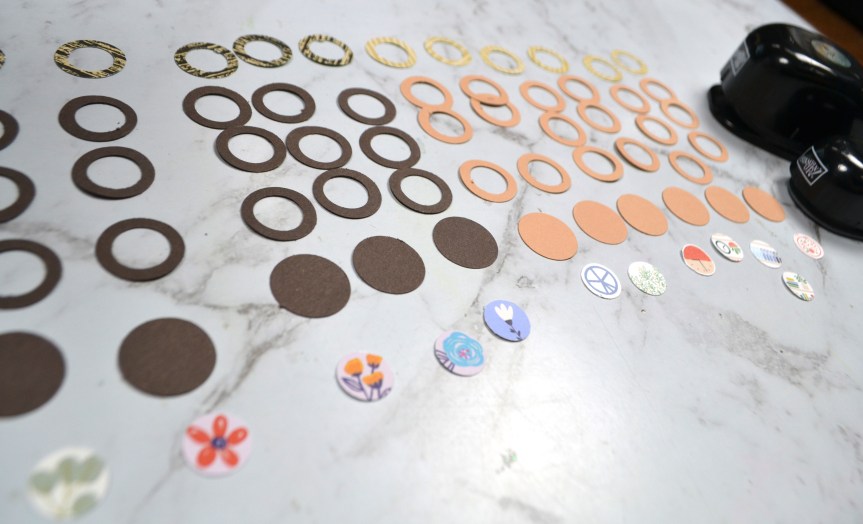 I’ve done this technique before in this DIY embellishmentvideo, but at the time I was mimicking metal brad flairs. That technique totally translated into this technique. I used a 1/2 inch punch and a 3/4 inch punch to create rings. The top layer is the decorative layer and the three solid colors are the thickness/filler layers to create depth and texture. Finally, the large punch was used to create solid base circles. With the smaller punch I punched images out of scraps of patterned paper. Then it was just a matter of layering them all up.