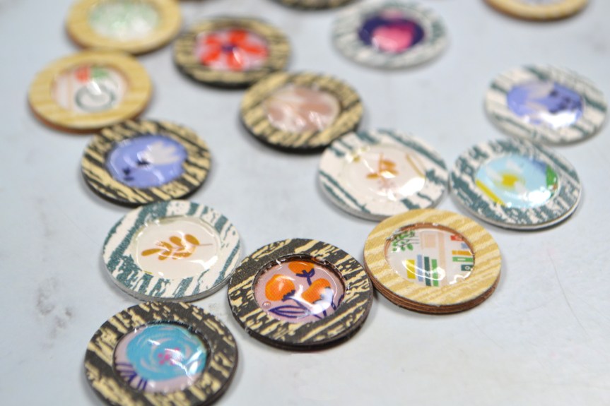 That is it! While it took a little bit of time, it wasn’t hard to create these little embellishments. Next time I may speed up the process by creating cut files in the Cricut to do all the circle & ring cutting for me. That way I could also get thinner rings as well. That would make them more button-like. So, while these aren’t exact replicas of wood button flair, I really like how the came out!