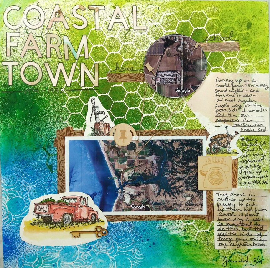 I turned to the Counterfeit Kit Challenge blog for some inspiration. They offer crafty challenges on the 12th and 18th of every month to help boost our creativity. And I really needed that. April 12th’s challenge was titled “Al Fresco” and it was about finding inspiration in the outdoors in some way. I took on that challenge with some mixed media on a double page layout about a beach trip.