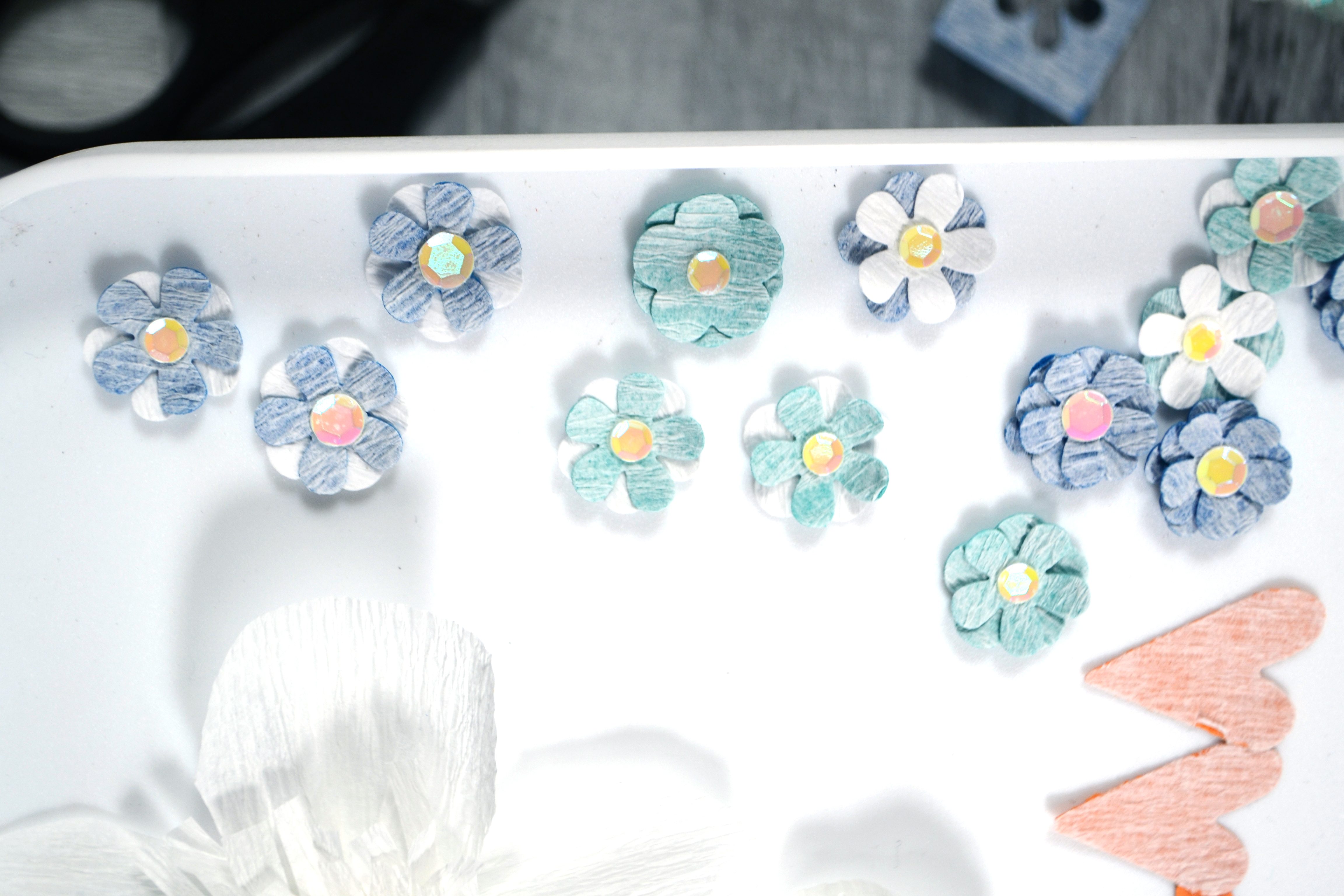 I had fun making the ribbon, so I kept playing with the crepe paper. I used to to clip and create flowers (left). Then I glued it down to cardstock and used some punches to create even more flowers (right)