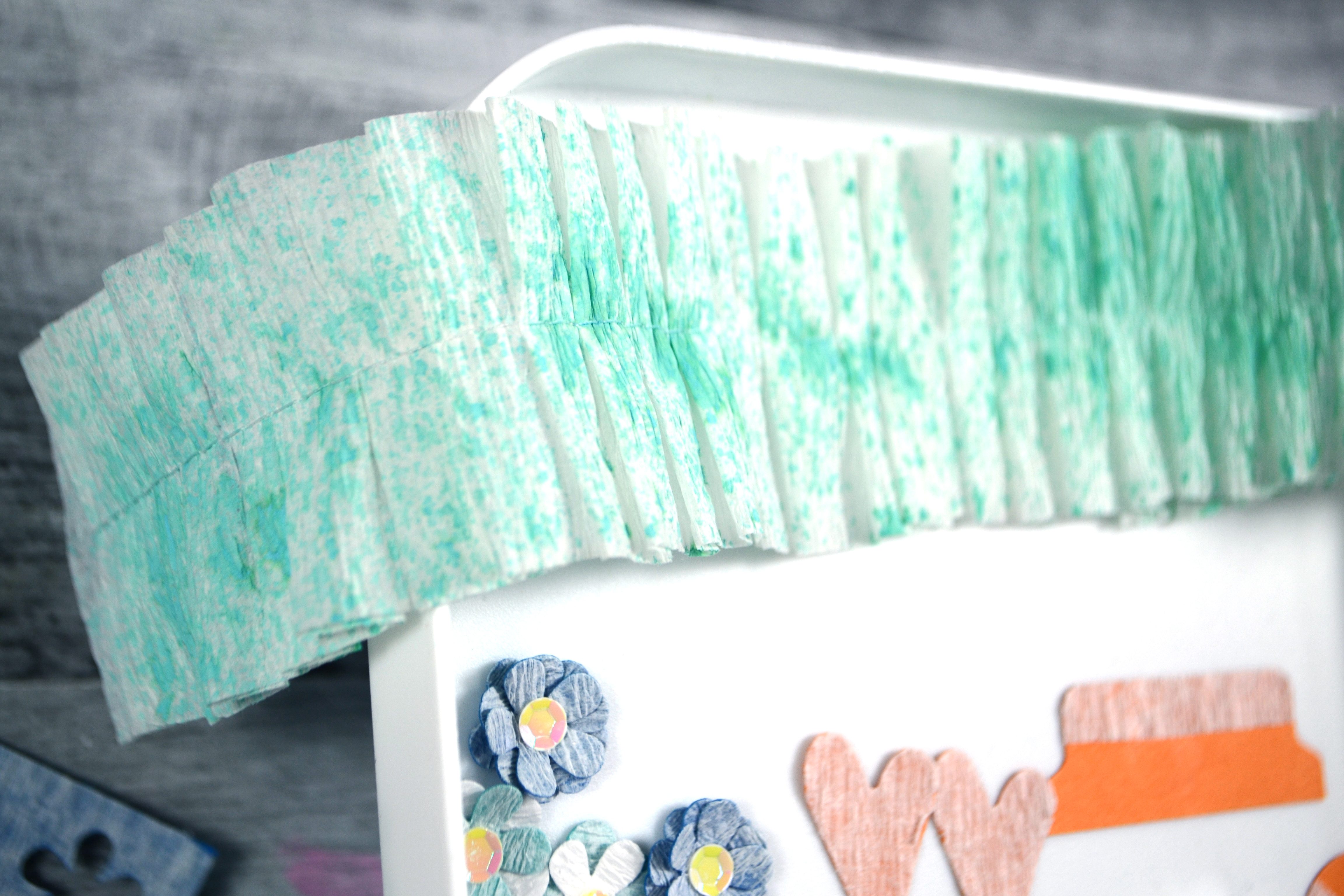 First, I created my forgery projects as usual. I was inspired by that pink ruffled crepe ribbon on the right. I made my own ruffled crepe ribbon out of party streamers. Super easy and super cheap!