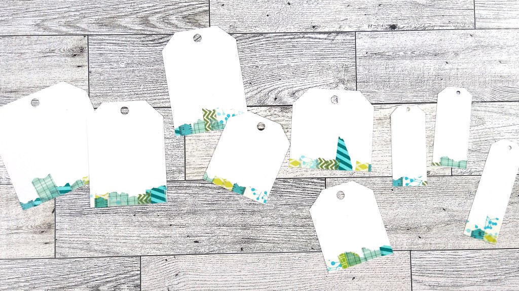 I created a bonus set of embellishments from this project. I saved all the little tails that I cut off of the washi tape when I trimmed the straight paper edges down. Those I applied to the edges of scrap paper. I cut that paper down and formed tags!